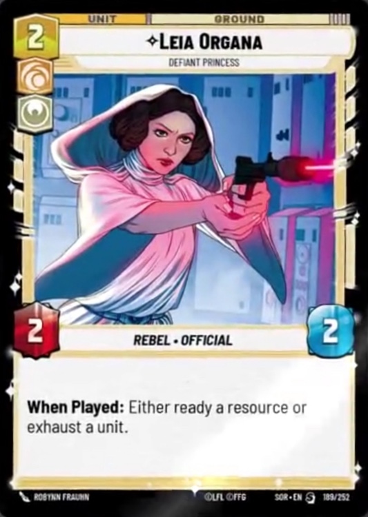 Generally Midrange decks have some early curve control options and build a board and win in the mid to late game more aggressively. You will see some smaller units for some presence but early removal is common then it switches and becomes more of an aggro deck late. These decks are a little more flexible able to play a control game v Aggro decks and play more Aggro v Control decks. In SWU a card like Leia would fit nicely into midrange as it could give you some control or tempo.
