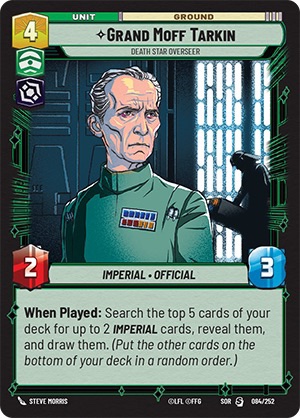 Simply put Card Advantage is having more cards (options) than your opponent. This is most commonly achieved through card draw effects. One we see in SWU already is Grand Moff Tarkin. His ability to search and draw 2 Imperial Units when he is played. If you had 5 cards in hand, you play Tarkin, draw 2 imperial cards, you are now at 6 cards in hand. If your opponent has 5 or less cards in their hand you now have card advantage. Why is this important? More cards means more options, in almost every card game, having access to more tools is always a good thing. Drawing more cards than your opponent can help keep you on curve for your drops, or makes you find your removal pieces you need, or find the combo pieces for your alternate win strategy.