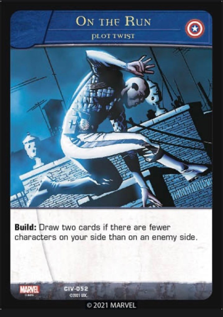 Gaining card advantage can also help you come back when you are behind, as seen in the On the Run Plot Twist (event) from VS System 2PCG, you play this card during your build phase and if you are behind on the board it allows you to draw 2, having you go +1 with cards in hand, and the build phase is also the step where you recruit characters (play them to the board) so triggering this when you are behind on board presence can be a game changer allowing you to draw into your units tonight back or take over board control for yourself.