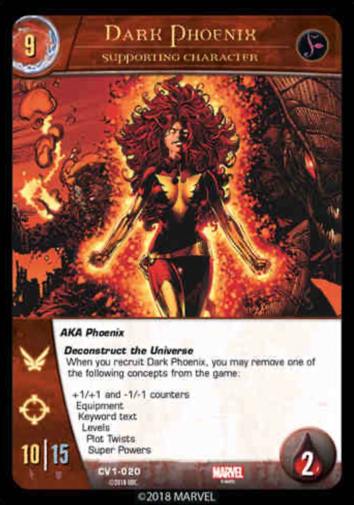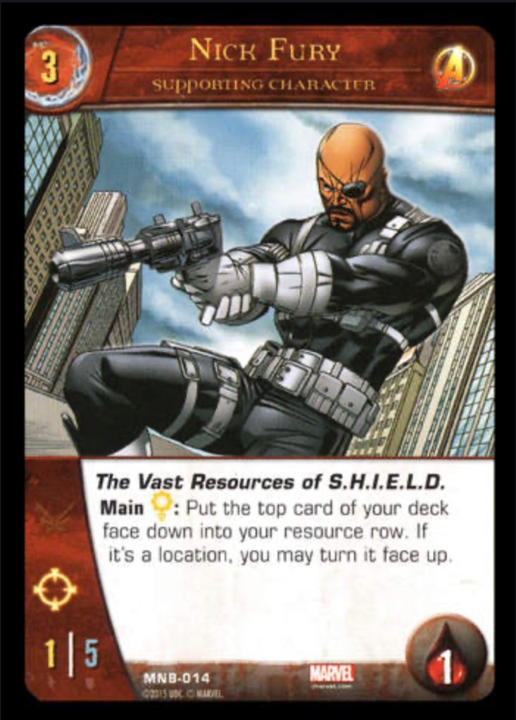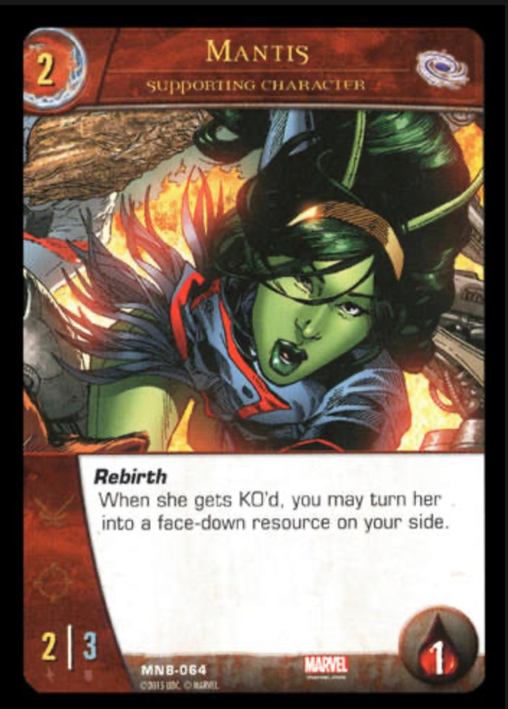 In VS System 2PCG you start the game by drawing 7 cards and placing a card in your resource row. Each turn you draw 2 cards and normally can add 1 card per turn to your resource zone. For VS system 2PCG, which I’m using a lot as an example because the games seem very similar to me, there’s a few cards that help you “ramp” or gain extra resources. Mantis becomes a resource when she’s defeated. And Hunter searches out a location for you which adds a resource. Nick Fury is another card that can gain you resource advantage. These cards could all be played together to ramp up fast and play a boss monster or bomb unit to the field, like Dark Phoenix, who is the ultimate boss monster in VS System 2PCG. She is so ridiculous she removes a whole aspect of the game from play. GG.
