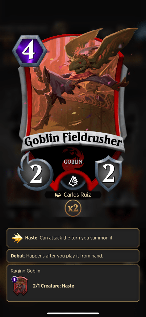 Lastly we will take a look at board advantage. Board advantage is having a stronger board state than your opponent. It can mean having more smaller units flooding your side so that your opponent can’t keep up. Or it can mean having more larger, impactful units that will stick around than your opponent. In Spellslingers a lot of early rush decks ran Goblin Fieldrusher because when you played it it also summoned a 2/1 goblin with haste to the field. Getting 2 units for one card on the board and being able to attack the turn it’s played is big and a decent way to gain board advantage.