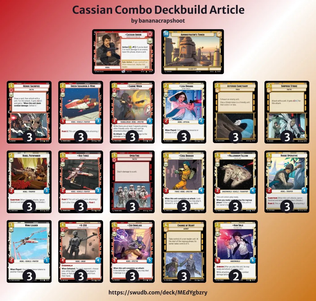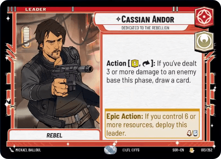 To help understand what I’m talking about I’m going to go to https://www.swudb.com and build a new deck from scratch. For a leader I’m going to pick Cassian because I think he is interesting and has a cool ability that I hope we can find payoff for. His front side lets us draw a card if we have dealt 3 damage to a base. Then he deploys on 6 resources and gains Saboteur and has the ability to draw a card after dealing damage to a base. He’s an aggression aspect but has a more midrange ability so we will have to find a pairing we like with him. My plan with Cassian is to build a deck that can survive early and use Heroic Sacrifice and Change of Heart plays to deal massive damage to my opponents base.