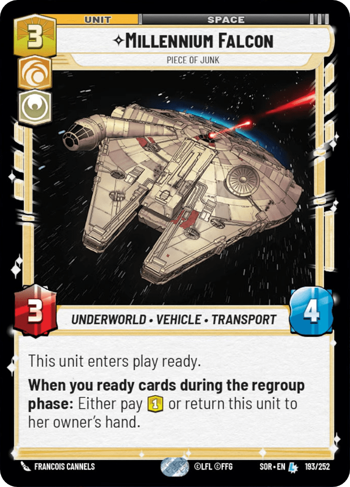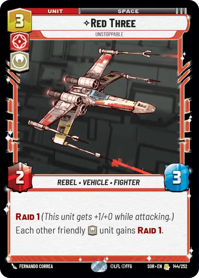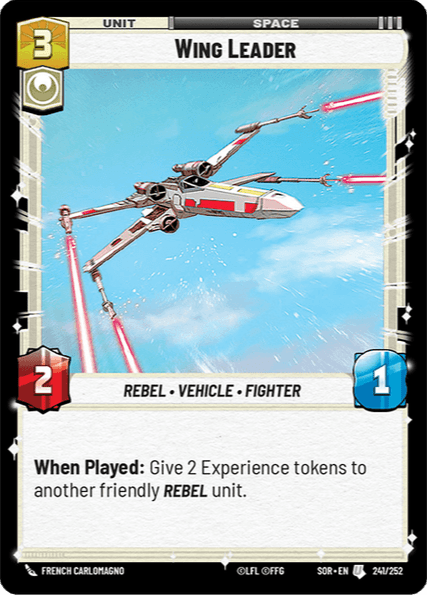 Now once I pick my leader and base I normally go to the space units first and get 12 of them selected. I do this because I want good options to play in the Space arena in case my opponent leans heavily into space I’m not caught defenseless. I’m starting off right away with Green Squadron A-Wing since it is such an efficient 2 cost card in space being able to attack for 3 is very strong. Next I had Red Three since I’m heroic, having the Raid 1 buff to all my heroic cards is super nice. Next I’m adding the Millenium Falcon, for 3 cost it enters play ready. Now there is a tax you have to pay to keep it on the table but you can use this to semi heal it since when its bounced to hand all counters are removed, and it’s heroic so it gets Raid 1 from Red Three. Next I’m adding Wing Leader. Since I know I will be heavy on rebel trait units I feel confident knowing I can get the XP tokens on units without any problems.
