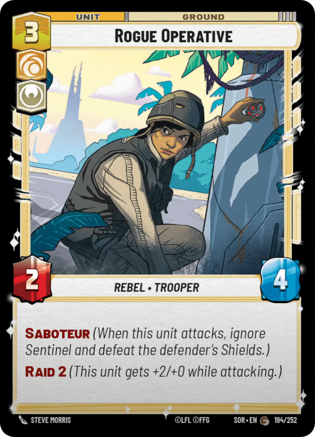 Now we are at 45 cards and I hit most of my guidelines so I’m going back to the ground arena to find some additional cards I can add to round off my curve. I’m going to add 2 copies of Han Solo to the deck, this gives me a late game strong unit to control the ground arena and the pseudo first strike is pretty baller here too. This last 3 spots I am really torn between fleet lieutenant and rogue operative. Fleet Lieutenant gives us an attack boost plus action compression, where the operative gives us saboteur and raid 2. Since we are not going full aggro but more of a combo midrange strategy I’m going to go the operative route.