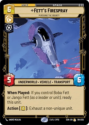 Here we go, the best space unit in the game currently. For 6 resources the amount of things going on here are bonkers. This thing comes in ready if boba or jango fett are in play, by the way your leaders are always in play. So play this in boba and you gurantee this thing enters play ready. On top of good stats it also has an action that costs 2 resources to put a non-unique unit on ice. It hits hard, it hits fast, and it ices your opponents dudes. Fett’s firespray my highest rated space unit in the game currently.