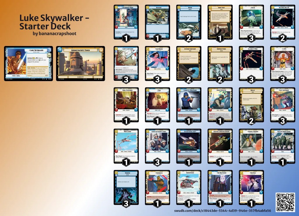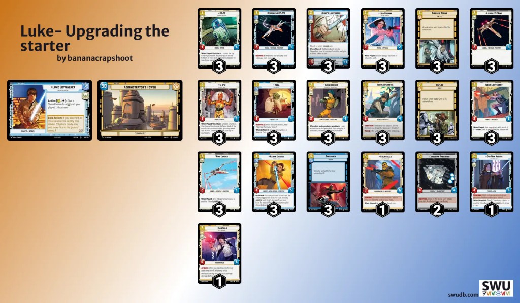 Hello again! I’m following up my Darth Vader Upgrade article with one about Luke Skywalker. This exercise is aimed to look at ways we can upgrade our Luke Skywalker starter deck using only commons and uncommons as options. A lot of changes are small, upping card counts for more consistency. So let’s jump right in.
