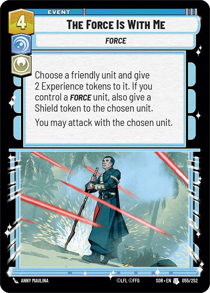 the force is with me in the deck MVP, the amount of times this card blows the game wide open is amazing. It gives us buffs, shields, and action economy with the attack off of it. You can play on anything just make sure a force units out. I like playing it on Baze to make him a shielded 4/7 with sentinel and grit.