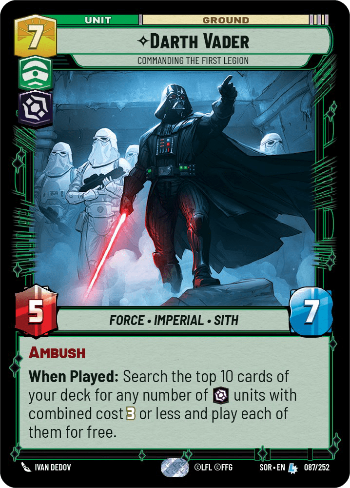 First on our list of S-tier cards is the big Sith Lord himself, Darth Vader. Vader was identified immediately as likely to be one of the most powerful units in the Spark of Rebellion set, and he did not disappoint. At 7-cost, Vader boasts a 5/7 stat line with Ambush, and even brings another (cost total 3 or less, villainy) unit(s) along with him. Vader was a quintessential component of some of the absolute best decks in the set 1 meta, such as Command Boba Fett and Command Krennic. Vader offers everything you could possibly want from a 7-cost bomb unit. There is no reason to believe he is going anywhere in the set 2 meta, although he will see some competition in the 7-cost command villain slot via the likes of Maul, who may steal a spot in many Underworld tribal decks.