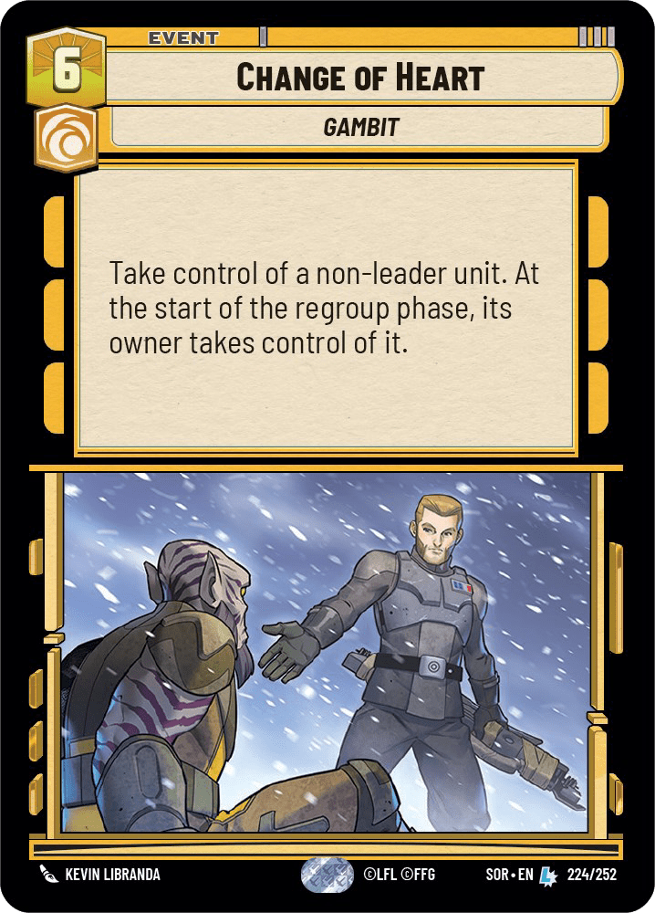 Last on our list of B-tier legendaries is Change of Heart. Change of Heart is another stylistic staple of most TCGs (and hell, in some cases… *cough cough* Yugioh *cough cough*… it’s just called, you guessed it, Change of Heart). Change of Heart allows you to take control of a non-leader opposing unit for the phase, returning control to its owner during the regroup phase. In the set 1 meta, Change of Heart saw some mainboard usage in some tier 2 decks and even a couple Cunning Sabine decks, but mostly was a sideboard staple for many Cunning aggro or mid-range decks, such as mono Cunning Boba Fett and Command Boba Fett, or Command Han Solo. If Change of Heart were to move up these tier rankings, it would likely be on the back of Emperor Palpatine, whose On Attack ability allows you to defeat the stolen unit instead of returning it. Nonetheless, it should remain a card that is at least seeing sideboards regularly as tech against ramp/control decks.