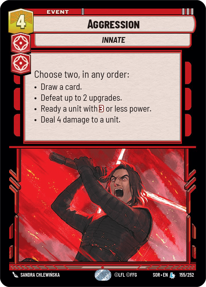 And finally, the last of our legendaries and our final Aspect card, Aggression. Similarly to Command, Aggression offers 4 choices (draw a card, defeat up to 2 upgrades, ready a unit with 3 or less power, and deal 4 damage to a unit) that simply do notstack up to those offered by Cunning and Vigilance. Aggression saw very little play in the set 1 meta, only showing up in some mono Aggression decks, such as mono Aggression Sabine Wren. To rise in these rankings, Aggression needs a mono Aggression deck to rise to relevance. This is perhaps most possible with new leader Kylo Ren, but Kylo Ren’s card ability makes 1 of these options (draw a card) a veritable blank when he is deployed.